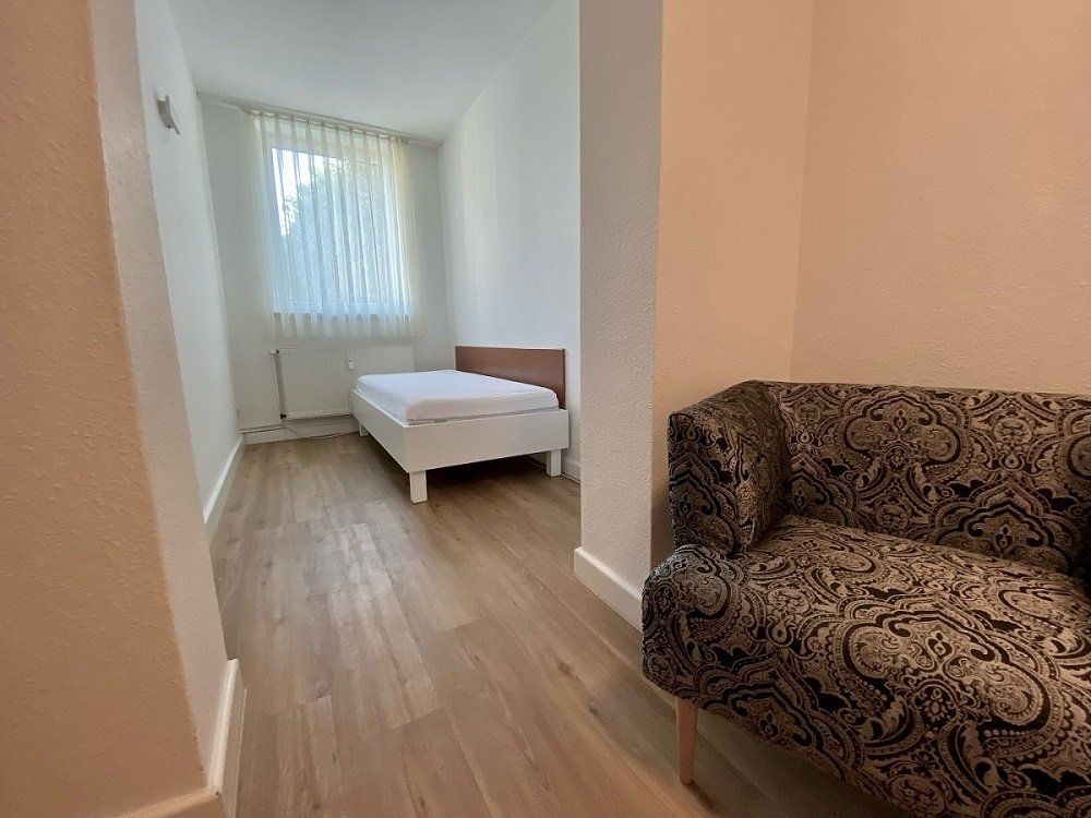 Der Wohnbereich von Zimmer 1 verfügt über einen Schreibtisch, einen Kleiderschrank sowie über einen Fernseher und einen gemütlichen Sessel. Der Schlafbereich mit dem Bett befindet sich in einem kleineren zweiten Zimmer. In diesem Apartment haben Sie zwei große Fenster und somit viel Licht im Raum.