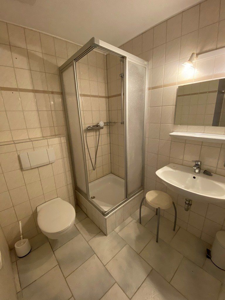 Ihnen steht eine kleine Küche zur Verfügung, die mit einem Kühlschrank, einem Herd, einem Wasserkocher und auch ansonsten allem Notwendigen für den täglichen Bedarf ausgestattet ist (z.B. Teller, Tassen, etc.). Ihr Badezimmer verfügt über ein WC, Waschbecken und eine Duschkabine.